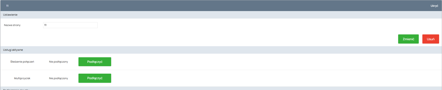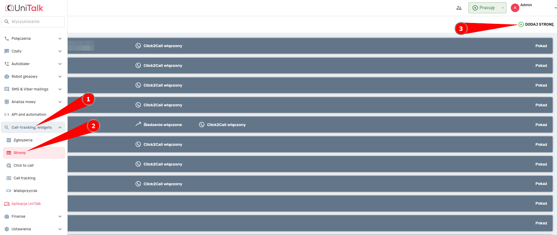 1. Przejdź do sekcji „Witryny” w systemie UniTalk i kliknij przycisk „Dodaj witrynę”. Przejdź do sekcji „Strony” na swoim koncie UniTalk i kliknij „Dodaj stronę”.