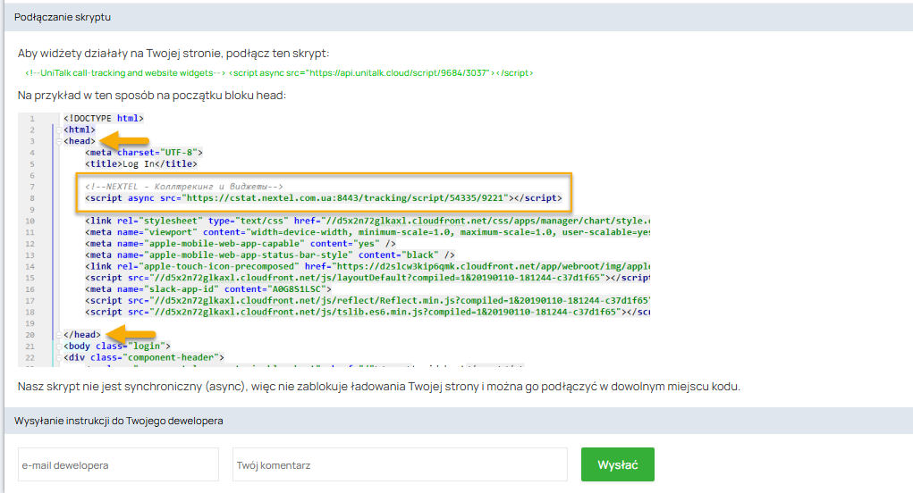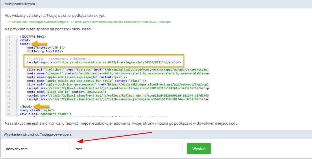 Skrypt dla strony utworzony na koncie UniTalk jest unikalny i powinien zostać zainstalowany w kodzie strony, dla której został stworzony. W niektórych przypadkach, w określonym celu, konieczne jest zainstalowanie tego samego skryptu w kodach kilku różnych witryn, w takim przypadku należy pamiętać, że funkcja Call Tracking i przycisk zamówienia połączenia będą działać identycznie na wszystkich stronach, na których zainstalowano skrypt. Skrypt dla strony utworzony na koncie UniTalk jest unikalny i powinien zostać zainstalowany w kodzie strony, dla której został stworzony. W niektórych przypadkach, w określonym celu, konieczne jest zainstalowanie tego samego skryptu w kodach kilku różnych witryn, w takim przypadku należy pamiętać, że funkcja Call Tracking i przycisk zamówienia połączenia będą działać identycznie na wszystkich stronach, na których zainstalowano skrypt. Aby każda strona miała swój własny unikalny Call Tracking i przycisk zamówienia połączenia, należy zainstalować unikalne skrypty dla każdej strony.
