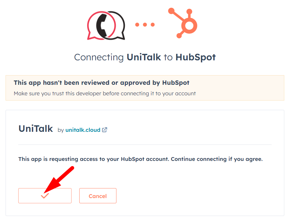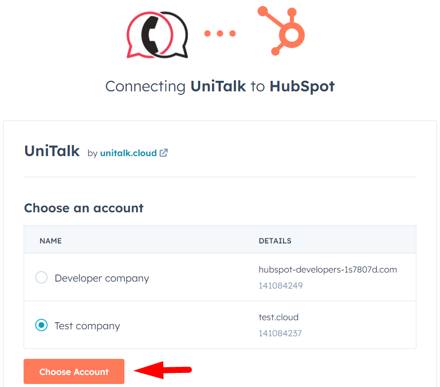 • Wybierz konto HubSpot, które chcesz połączyć z aplikacją UniTalk.