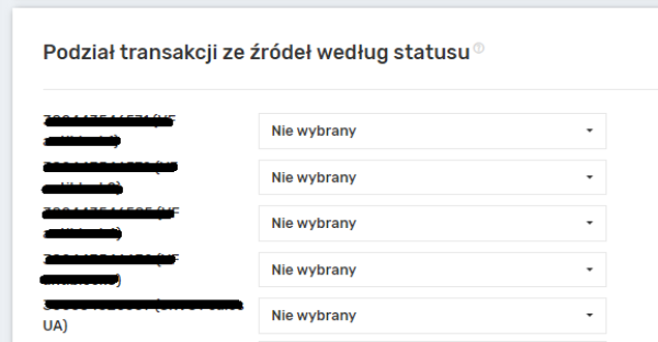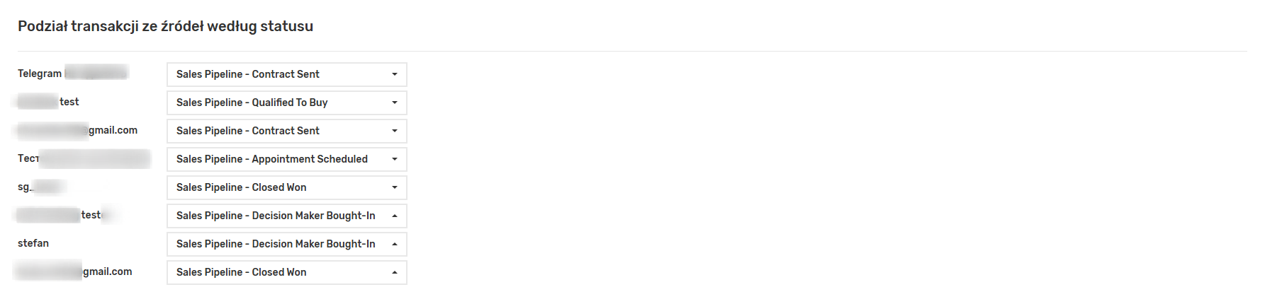 Podobnie jak w ustawieniach połączeń, można wybrać, według których lejków sprzedażowych i statusów rozdzielać transakcje podczas ich tworzenia.