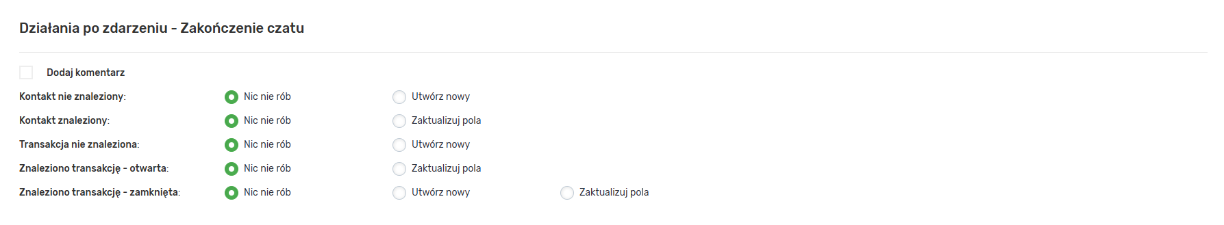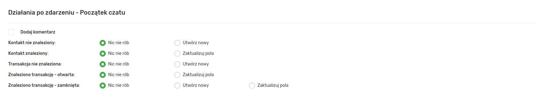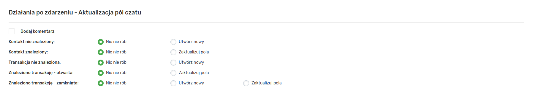 W każdym z tych przypadków konfiguruje się, czy należy tworzyć komentarze, zadania, a także określa się działania wobec kontaktów i transakcji.