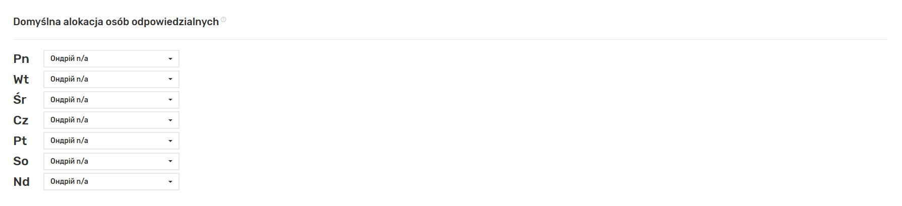 Podobnie jak w ustawieniach połączeń, można przypisać operatora na każdy dzień tygodnia. Jeśli nie uda się automatycznie określić odpowiedzialnego, nowo utworzona jednostka (kontakt lub transakcja) zostanie przypisana do operatora wskazanego w tym polu.