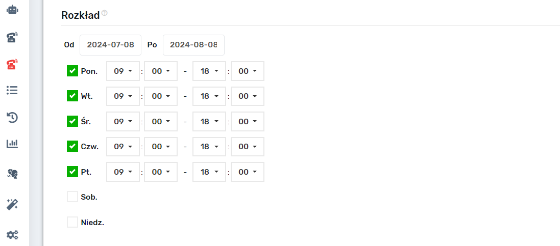 Rozkład połączeń. Domyślnie wybrany jest standardowy (jak dla Kijowa) tydzień pracy. Jeśli Twoi klienci są osobami pracującymi i planujesz dzwonić w godzinach pracy, to «I tak się uda!». Lepszą konwersję uzyskuje się w porze lunchu i popołudnia.