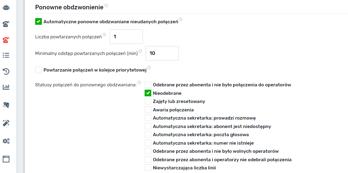 W dialerze zawsze są nieudane połączenia, część osób nie odbiera telefonu lub z innych powodów do połączenia nie dochodzi. Wszystkie takie połączenia można ponowić. Istnieje możliwość określenia ilości powtarzających się połączeń, interwału między nimi,oraz ustalenie ponownego połączenia z priorytetem lub bez i wybieranie statusu połączenia, oddzielając tych, którzy nie muszą oddzwaniać, na przykład tych, którzy podnieśli telefon i zresetowali połączenie.