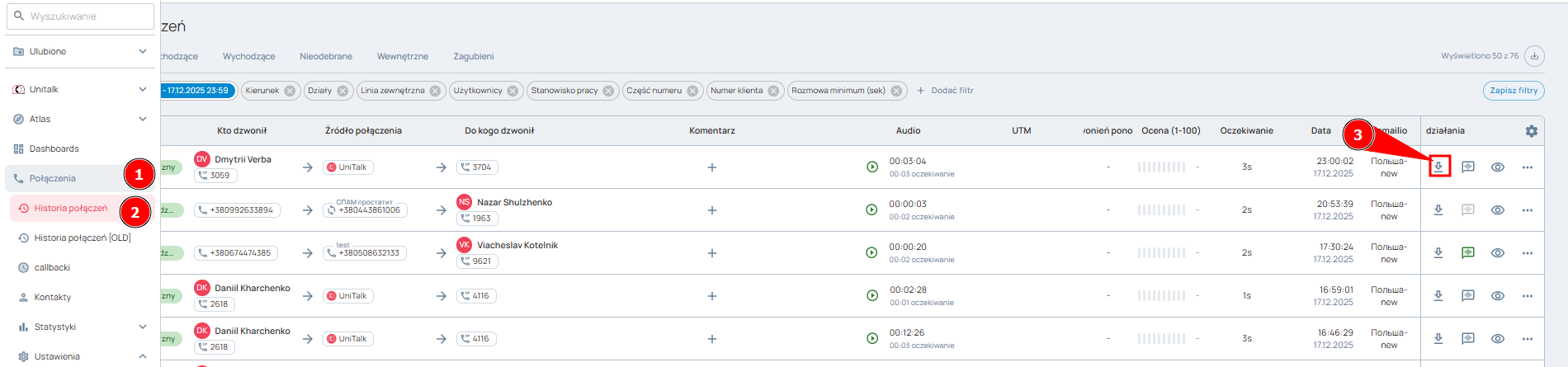 Przechodzimy do historii połączeń UniTalk i pobieramy na swój komputer nagranie tego połączenia.