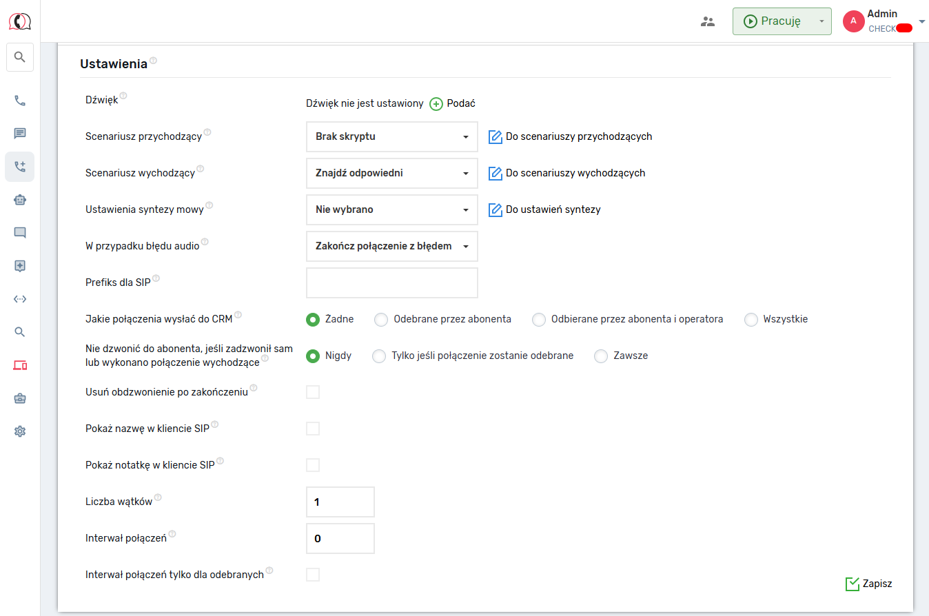 W automatycznym dialerze z transferem na pracownika ilości wątków — niezwykle ważny parametr. Zmieniając liczbę wątków, kontrolujesz obciążenie konsultantów. Idealnie jest przydzielenie pracownika kontrolującego, który będzie obserwował proces automatycznego wybierania numeru i zmieniał ilość wątków w „w locie”.
