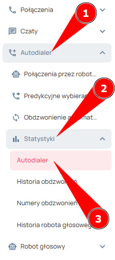 W sekcji „Autodialer” wyświetlane są informacje dotyczące każdej rozmowy telefonicznej w ramach projektu, w tym statystyki.