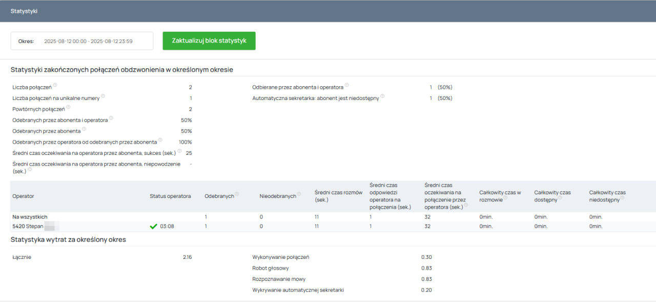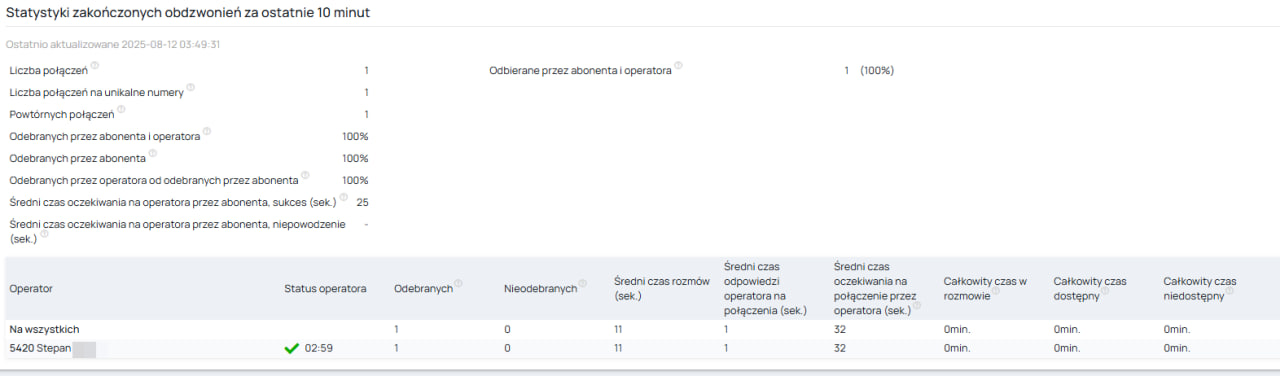 Jeśli w połączeniu telefonicznym skonfigurowano przekierowanie połączenia do operatora/operatorów, w sekcji „Połączenia telefoniczne” dostępne będą informacje dotyczące statystyk tego połączenia wraz ze szczegółowymi informacjami na temat operatorów.