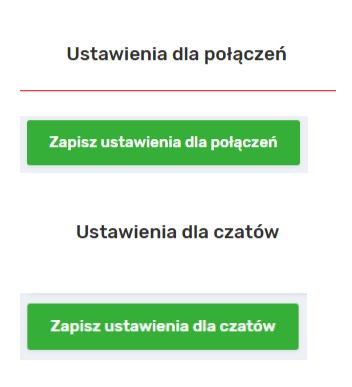 Strona integracji AMO/KOMMO zawiera 2 bloki ustawień – dla połączeń i dla czatów. Każdy z tych bloków ma osobne ustawienia i własny przycisk do zapisywania ustawień*.