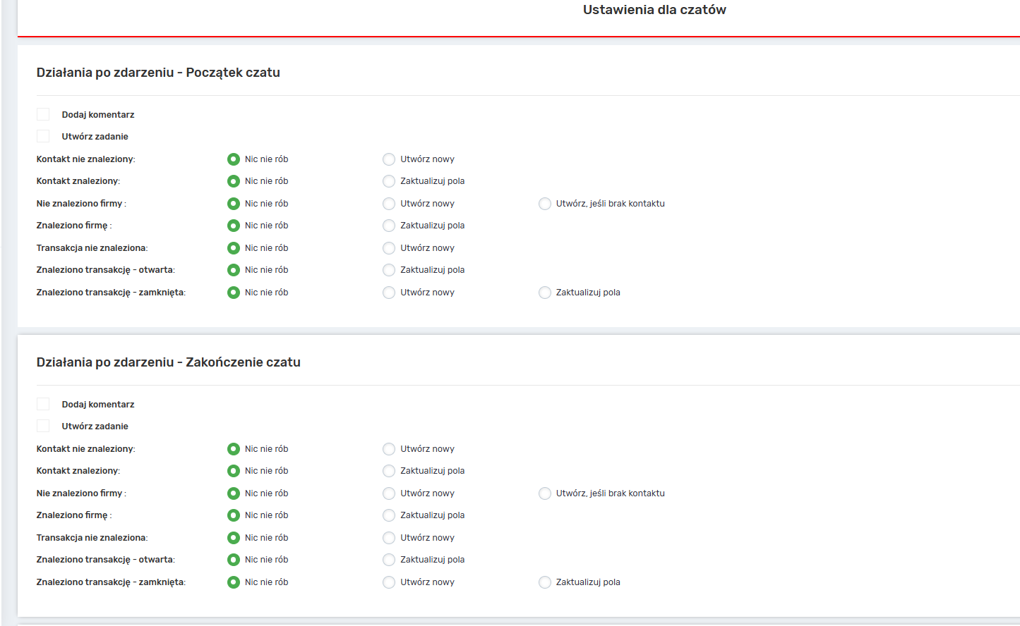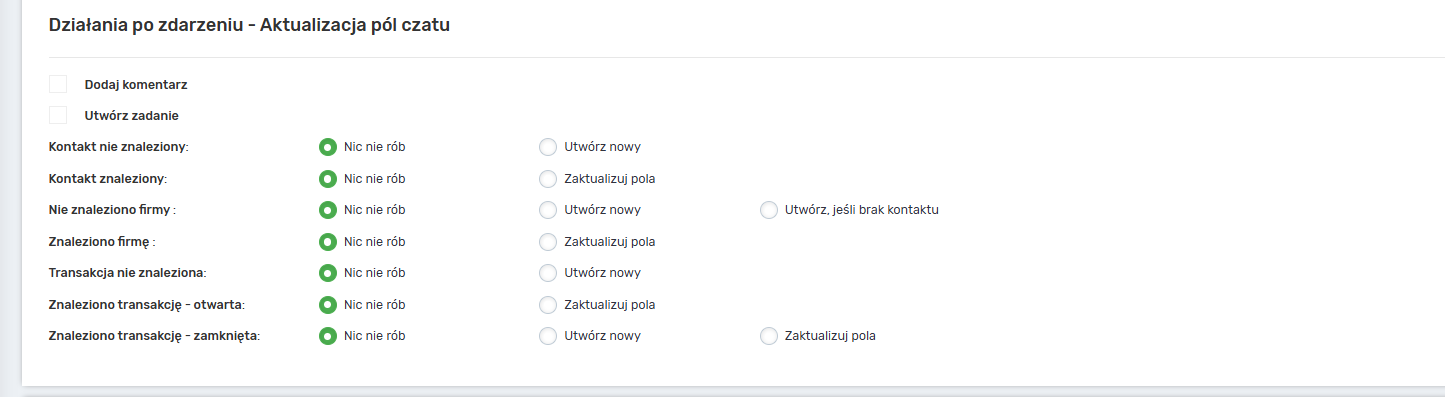 W każdym z tych przypadków możesz skonfigurować, czy chcesz tworzyć komentarze, zadania i definiować działania z kontaktami, transakcjami i potencjalnymi klientami.