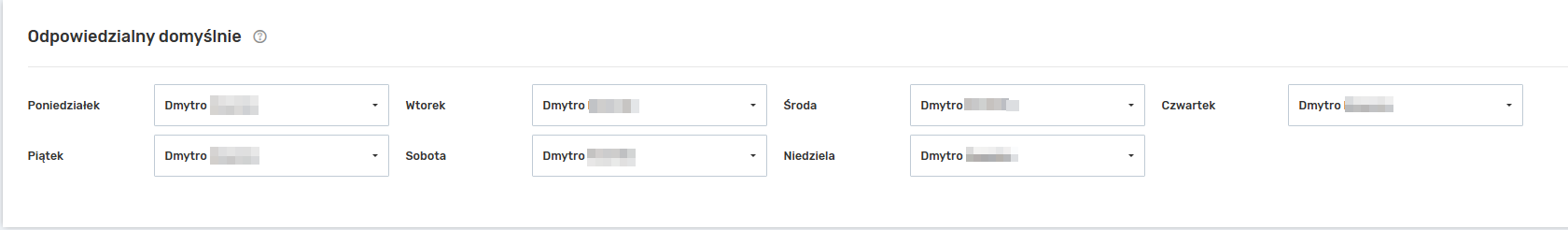 Podobnie jak w przypadku ustawień połączeń, można przypisać agenta do każdego dnia tygodnia. Jeśli z jakiegoś powodu nie można automatycznie zidentyfikować osoby odpowiedzialnej, utworzony podmiot (kontakt, transakcja lub potencjalny klient) zostanie przypisany do agenta określonego w tym polu.