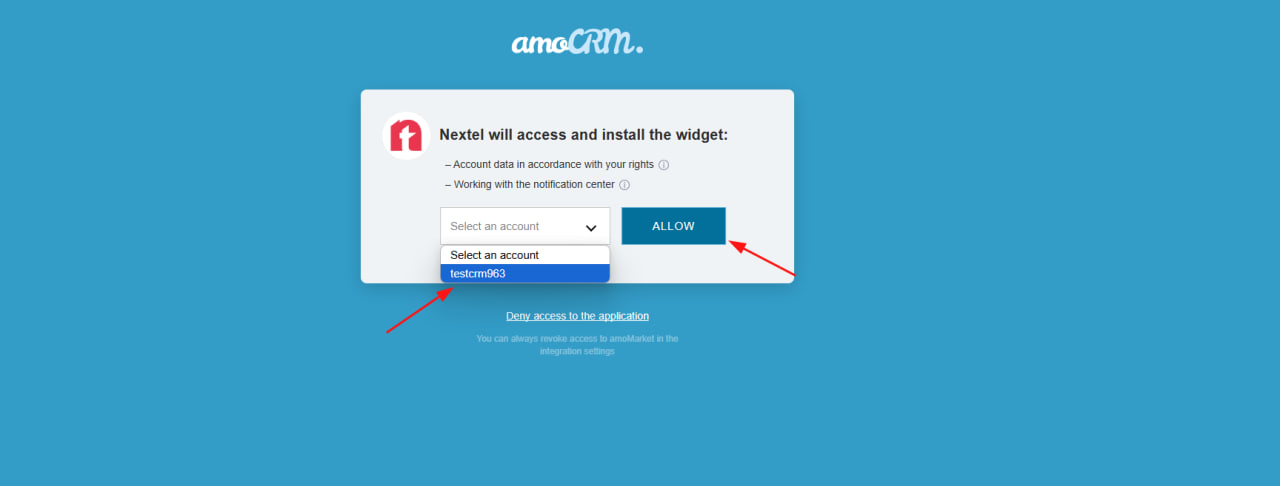4. Po nawiązaniu połączenia na stronie AmoCRM pojawi się następujący komunikat