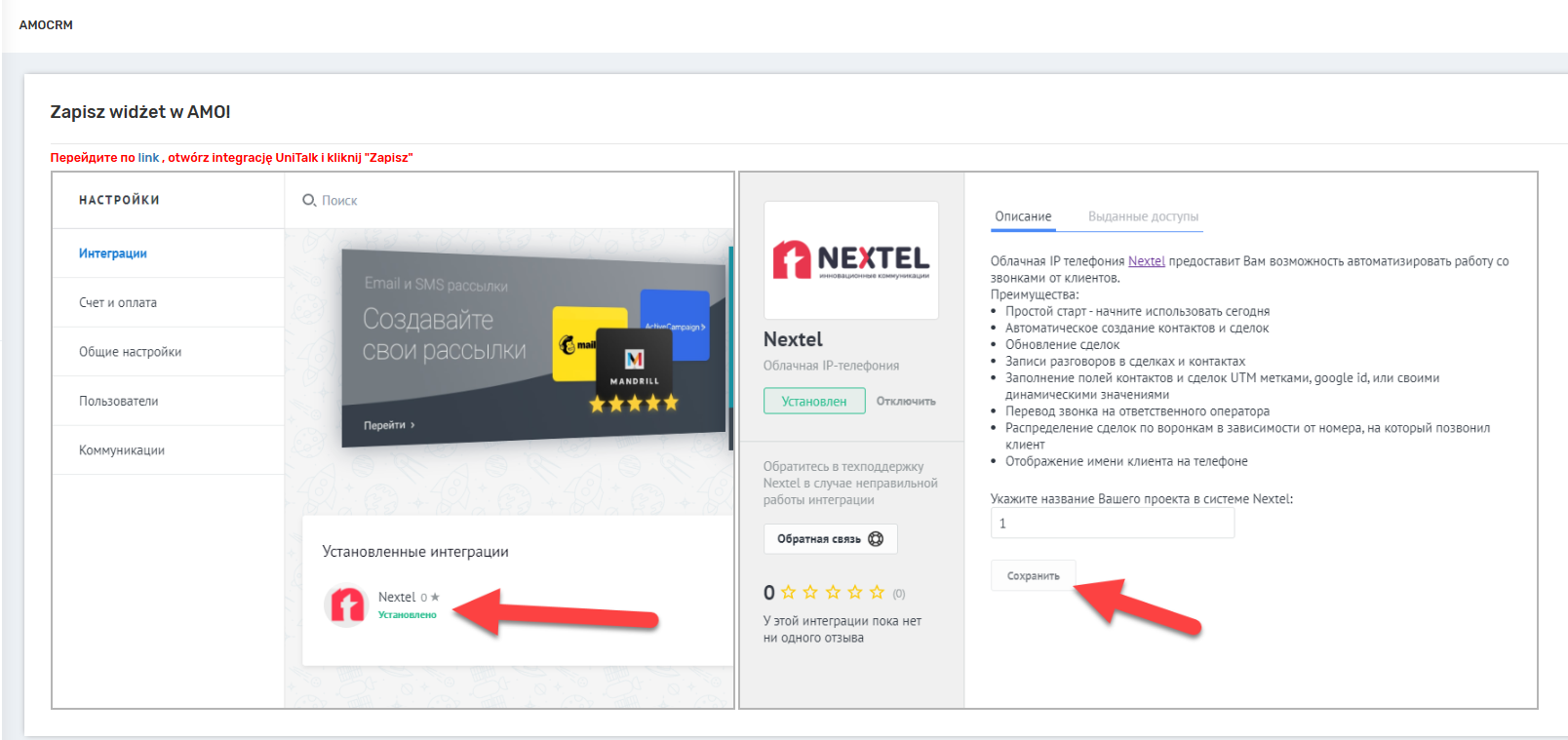 Instalowanie aplikacji UniTalk z AMO/KOMMO marketplace