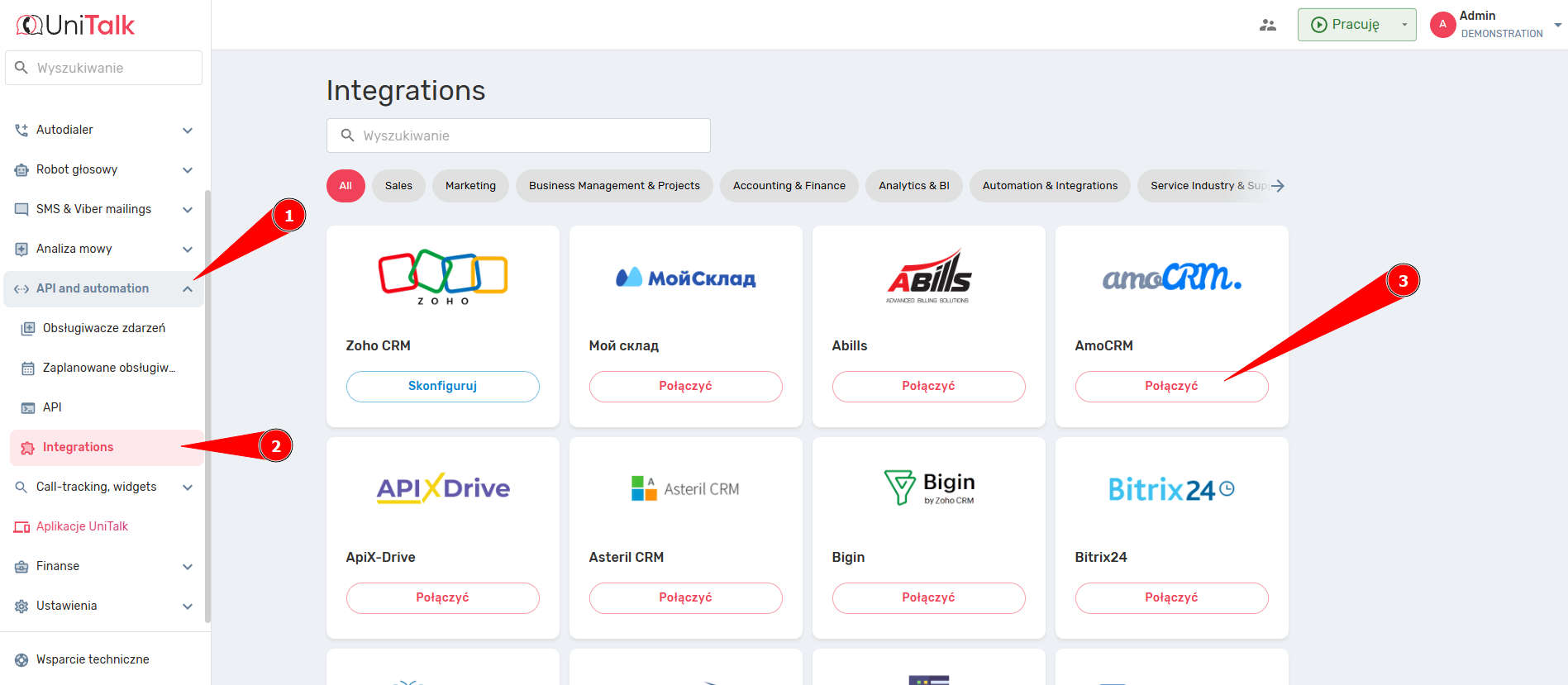 1. Na koncie osobistym UniTalk przejdź do pozycji menu „API oraz automacją” — „Integrowanie”, a następnie do pozycji menu „AmoCRM”.