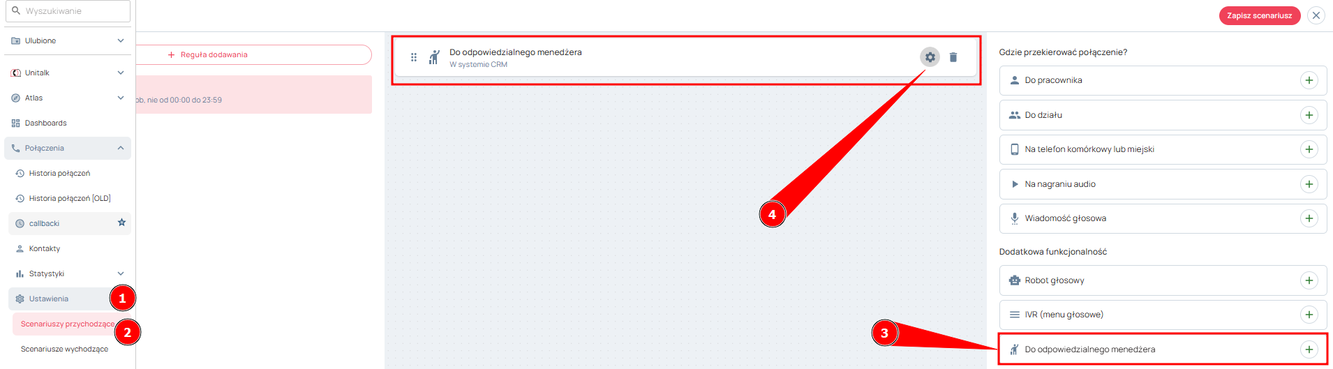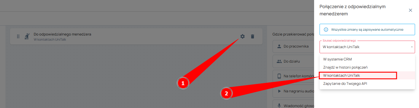 Informacje te można również wykorzystać podczas tworzenia scenariusza połączeń przychodzących w sekcji „Połączenia” -> „Ustawenia”. Załóżmy, że chcesz, aby połączenie przychodzące było kierowane do odpowiedzialnego menedżera, następnie „wyszukaj odpowiedzialnego” wybierz „w kontaktach UniTalk”, a następnie zapisz skonfigurowany scenariusz.
