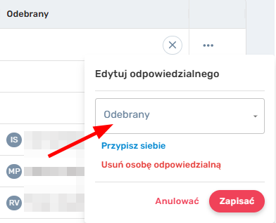 Istnieje również możliwość wyznaczenia siebie jako odpowiedzialnego, aby nie szukać siebie na liście i usunąć osobę odpowiedzialną.