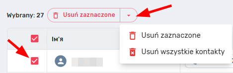 Aby nie usuwać dużej liczby kontaktów pojedynczo, można wybrać potrzebne kontakty, zaznaczając je, po czym pojawi się informacja o liczbie wybranych kontaktów oraz przyciski „Usuń wybrane” i „Usuń wszystkie kontakty”.