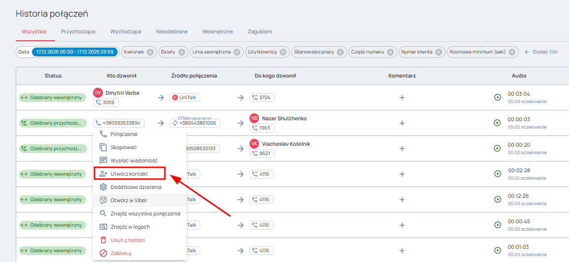 W sekcji „Historia połączeń” istnieje również możliwość kliknięcia na numer, z którego nadchodzi połączenie – pojawi się lista czynności, wśród których będzie opcja „utwórz kontakt”.