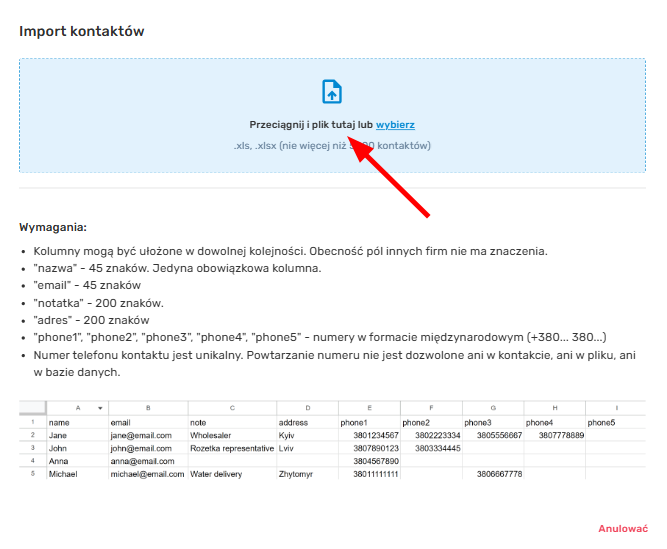 Do tej sekcji można dodać listę kontaktów, z których zamierzasz korzystać podczas wykonywania połączeń. W tym celu należy zaimportować numery, które można zestawić w tabeli, jak pokazano na poniższym przykładzie: