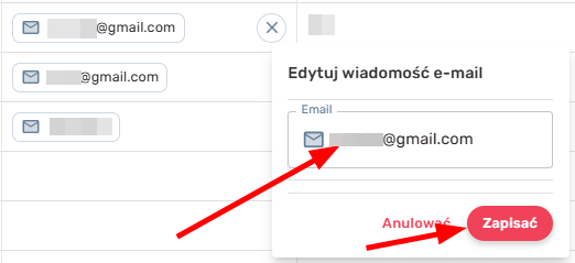 Aby edytować, należy kliknąć przycisk „Edytuj” w polu, które należy edytować, na przykład „E-mail”, po czym pojawi się modułowe okno, w którym należy podać lub zmienić informacje, a następnie kliknąć przycisk „Zapisz”.