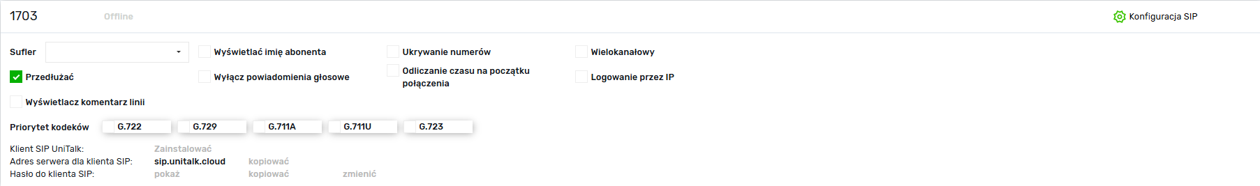 5. Po rozwinięciu ustawień odpowiedniej linii SIP uzyskujesz dostęp do parametrów linii SIP — login, hasło i adres serwera. Musisz wprowadzić te parametry w konfiguracji programy do połączeń.