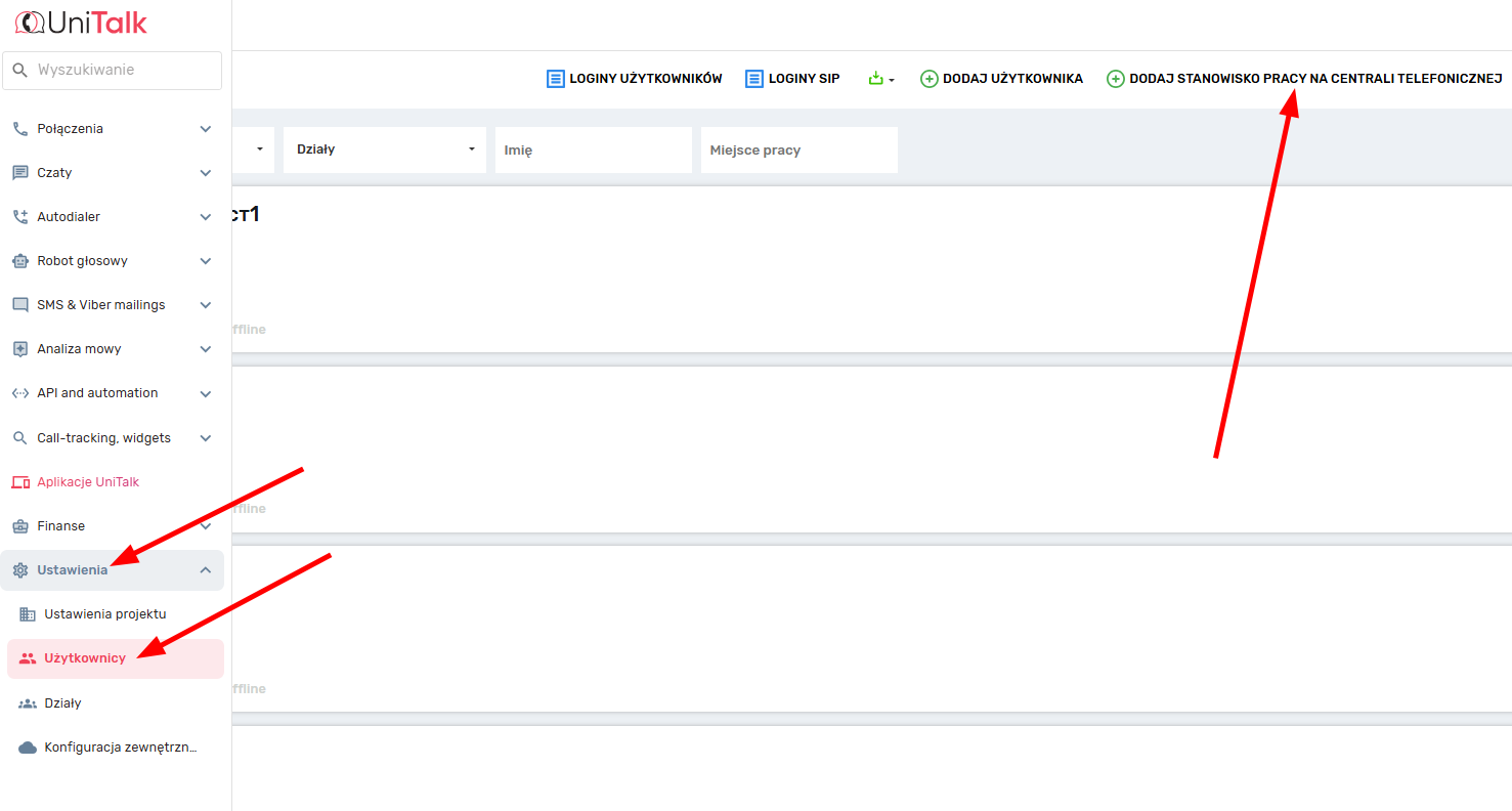 4. W każdym razie cokolwiek podłączysz, musisz przejść do sekcji menu „Ustawienia” -> ”Użytkownicy” Konta osobistego na stronie UniTalk.