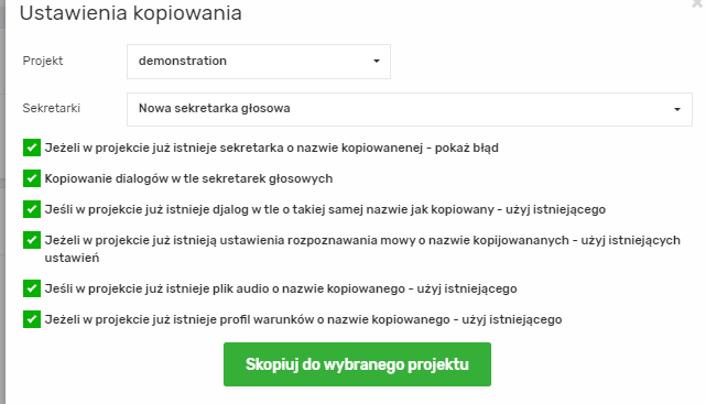 Jeśli chcesz skopiować roboty głosowe do innego projektu, możesz to zrobić na stronie robotów głosowych, klikając przycisk Kopiuj do innego projektu.