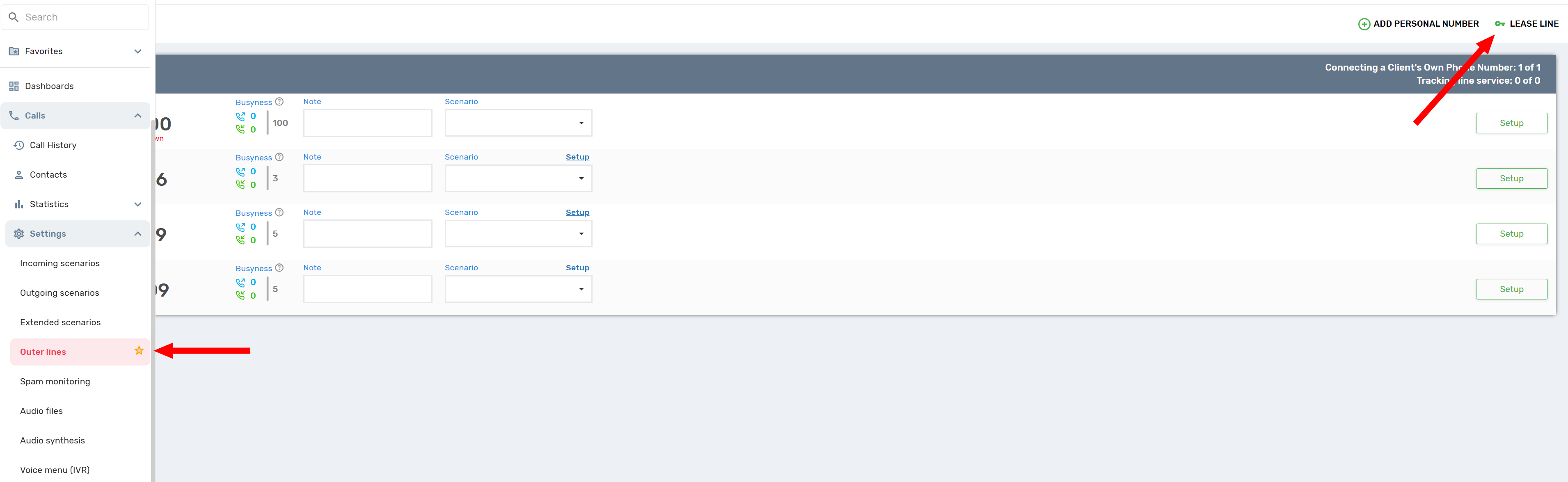 - Wynajmij numer UniTalk. Możesz to zrobić w sekcji „Połączenia” – „Ustawienia” – „Linie zewnętrzne”. Będzie to Twój numer odbiorczy (np. numer warszawski +48 22… lub mobilny numer SIP).