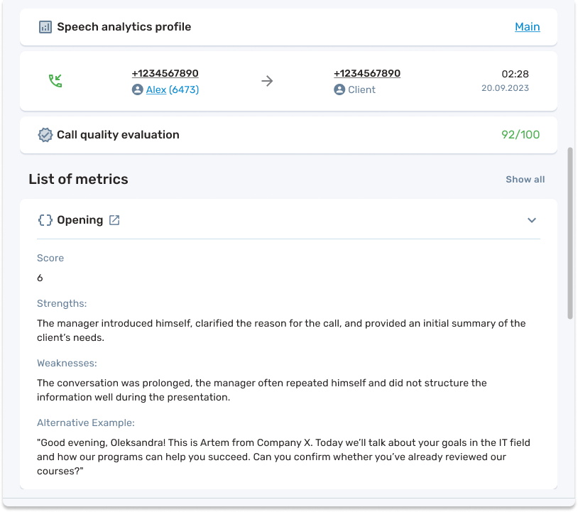 - Jakość pracy zespołu – analiza rozmów pozwala ocenić, na ile dobrze konsultanci trzymają się scenariuszy, czy prawidłowo reagują na zastrzeżenia, czy proponują odpowiednie rozwiązania. Analitykę mowy można skonfigurować tak, aby oceniać różne etapy dialogu (np. rozpoczęcie czy zakończenie) osobno, według różnych kryteriów oceny i parametrów. Poniżej przykład, jak może wyglądać ocena „rozpoczęcia” z zaznaczonymi mocnymi i słabymi stronami operatora, rekomendacjami dotyczącymi poprawy i reakcją klienta: