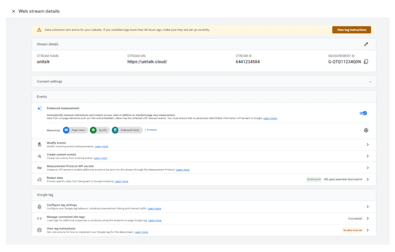 Po skonfigurowaniu i zapisaniu tych parametrów możesz rozpocząć konfigurację Google Analytics na swoim koncie osobistym UniTalk.