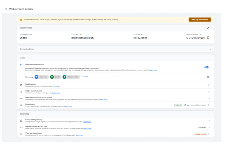 Identyfikator śledzenia Google Analytics jest automatycznie tworzony i przypisywany do każdego strumienia danych i zawsze jest zapisywany w formacie „G-XXXXXXXXXXXXXX”. Ten identyfikator jest wyświetlany w ogólnych informacjach o strumieniu.