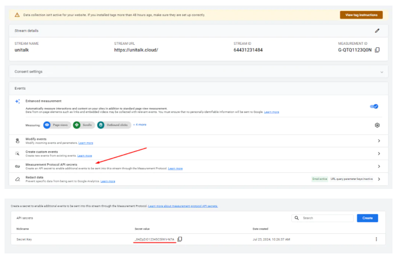 - Sekretny token API (klucz API) to tajny klucz, który umożliwia innym usługom i aplikacjom dostęp do danych w Google Analytics.