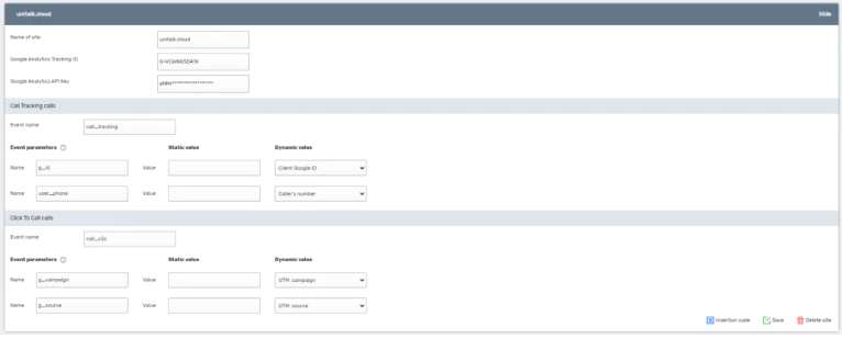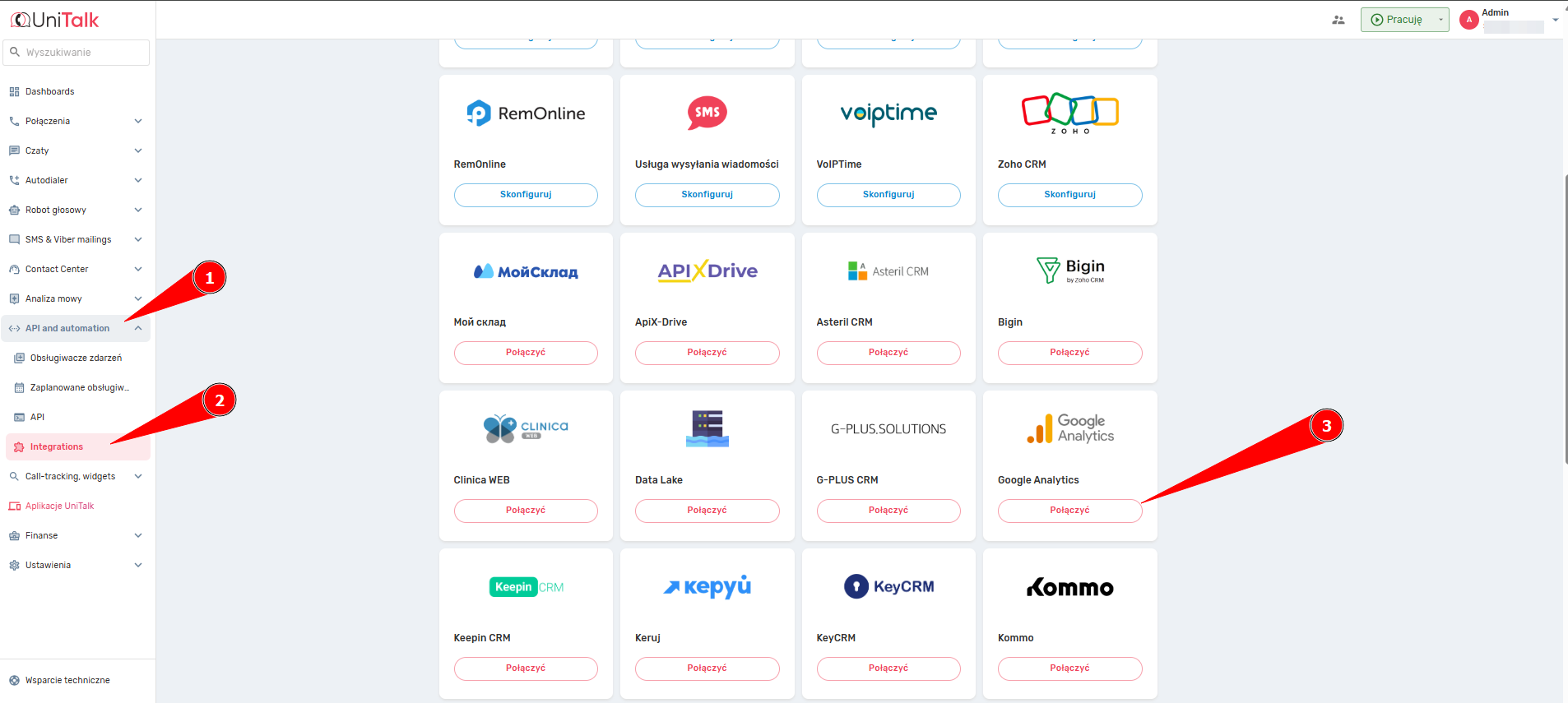 - Konfiguracja integracji na koncie UniTalk w celu przesyłania danych analitycznych dotyczących zdarzeń połączeń (śledzenie połączeń i funkcja „kliknij, aby połączyć”)