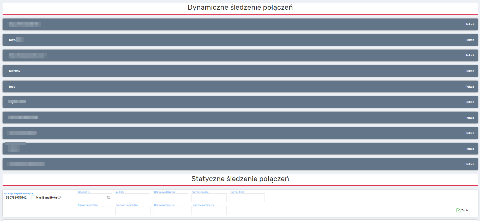 2. Po przejściu na tę stronę zostaniesz przeniesiony na stronę wyświetlającą wcześniej utworzone witryny z dynamicznym śledzeniem połączeń oraz listę numerów, które można wykorzystać do statycznego śledzenia połączeń.