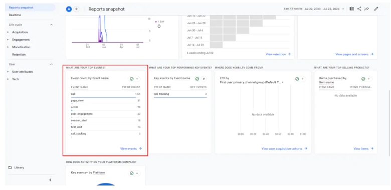 Działanie transmisji zdarzeń możesz sprawdzić na stronie Google Analytics w bloku „Raporty”