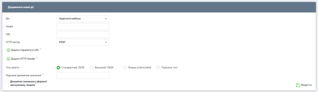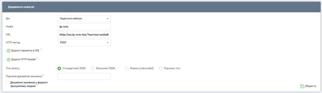 - URL – adres, na który wysyłane jest żądanie. W tym miejscu należy dodać link dostarczony przez system LP-CRM.